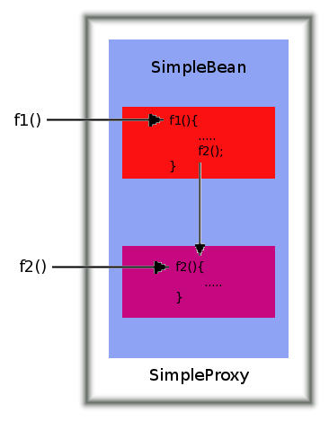 Come possiamo vedere la chiamata che il metodo f1() fa al metodo f2() non passa per il proxy, poichè una volta che si è delegata l'esecuzione del metodo all'oggetto reale tutte le chiamate interne all'oggetto non saranno più intercettate dal proxy. Per questo motivo non si possono creare advice su metodi che vengono chiamati da altri metodi dell'oggetto, o meglio si possono creare solo se questi metodi vengono usati da oggetti esterni, poichè altrimenti l'advice non verrà mai eseguito.