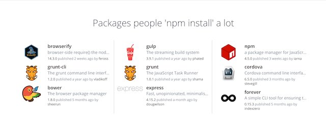 NPM è un package manager per Javascript (simile a Bower o Composer per PHP o RubyGems per Ruby) che permette di organizzare, installare, riutilizzare e condividere del codice. Quando installarete Node.js verrà installato anche NPM. Attraverso l’uso del comando npm potremo cercare, utilizzare o pubblicare utility e librerie, detti package o pacchetti o moduli, che sono mantenuti all’interno di un registro consultabile anche sul sito npmjs.com. Una volta installato, possiamo subito usare il comando npm e accedere agli innumerevoli pacchetti realizzati dagli altri sviluppatori. Inoltre, creando un account su npmjs.com potremo iniziare a pubblicare i nostri package. In ogni caso, potremo innanzitutto utilizzare i package pubblicati da altri all’interno del nostro progetto senza dover riscrivere del codice che altri hanno ottimamente realizzato e testato.