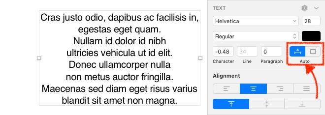Detto che possiamo sempre passare da una modalità all’altra direttamente nell’Inspector, se vogliamo inserire del testo secondo la modalità Fixed dovremo disegnare col mouse la casella di testo. Per far ciò occorre cliccare in un punto dell’area di lavoro e, tenendo premuto il tasto sinistro del mouse, dovremo disegnare la casella di testo rettangolare della dimensione che preferiamo. In questo caso quando la lunghezza del testo supera le dimensioni del box che lo contiene Sketch creerà automaticamente una nuova riga, al contrario di quanto accadeva nella situazione precedente in cui la larghezza della casella di testo veniva adattata automaticamente al contenuto. Un’altra differenza è che ora la casella di testo selezionata presenta 8 maniglie per il ridimensionamento e possiamo cambiare sia la sua larghezza che la sua altezza.