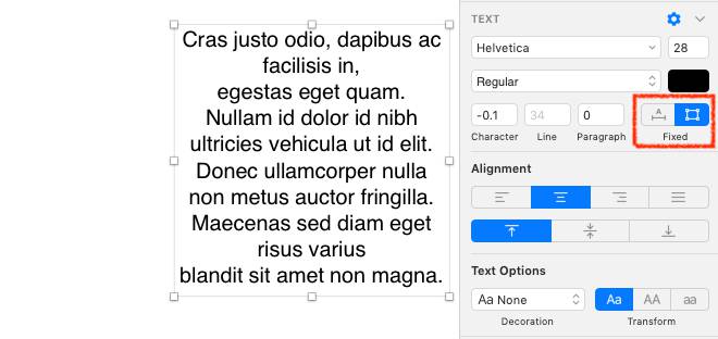 Ciò vuol dire che la lunghezza della casella di testo sarà adattata automaticamente man mano che digitiamo o incolliamo del testo. Il rovescio della medaglia è che Sketch non andrà mai a capo automaticamente, ma dovremo essere noi a premere il tasto INVIO. Se facciamo riferimento all’immagine riportata sopra, abbiamo dovuto modificare manualmente il frammento di testo che altrimenti era stato copiato nell’area di lavoro come un’unica riga. Inoltre, per questa prima modalità la casella di testo presenta solo due maniglie per il ridimensionamento. Non appena iniziamo a trascinarne una, Sketch passerà automaticamente alla modalità Fixed. Si tratta del secondo modo disponibile per aggiungere un frammento di testo all’area di lavoro.