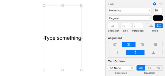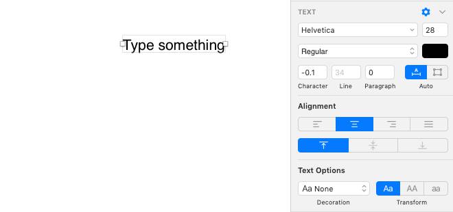 Esistono due diversi modi per inserire del testo. Se dopo aver selezionato lo strumento Text clicchiamo col tasto sinistro nell’area di lavoro, verrà aggiunto un nuovo livello di tipo testo con la scritta predefinita "Type something" già selezionata che dovremo rimpiazzare. Possiamo quindi iniziare a scrivere ciò che preferiamo o incollare del testo copiato in precedenza negli appunti di sistema. Se controlliamo l’Inspector notiamo che la dimensione della casella di testo in questo caso è settata su Auto.