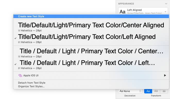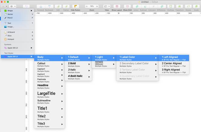 Dovremo quindi immettere il nome dello stile in cui possiamo utilizzare il carattere ‘/’ come separatore per organizzare gli stili in categorie. Così facendo Sketch organizzerà automaticamente gli stili di testo e potremo navigare fra le varie categorie per selezionare lo stile che preferiamo. La libreria di iOS (abbiamo visto come installarla all’inizio di questa guida) fornisce un esempio pratico di organizzazione degli stili di livello da cui possiamo prendere spunto per i nostri progetti.