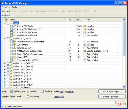 L’Android SDK Manager permette di gestire le varie versioni del SDK installate sul proprio computer. Dopo averlo avviato infatti esso mostra una lista di componenti indica se ognuno di essi sia installato o meno