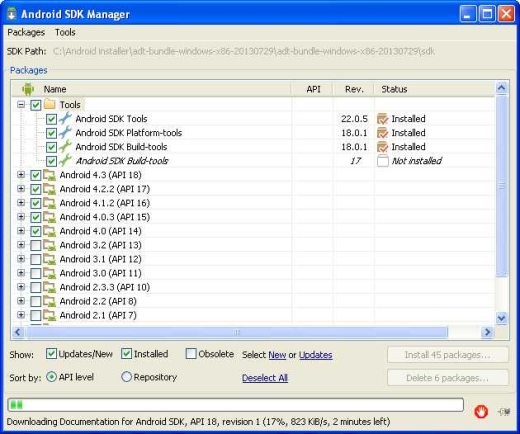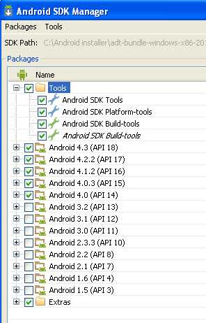 Quello che dobbiamo fare noi è scegliere i componenti da installare e procedere con l’installazione degli stessi. Per gli scopi del presente corso selezioniamo i Tools, le versioni di Android dalla 4.0 alla 4.4, e tutti gli Extras