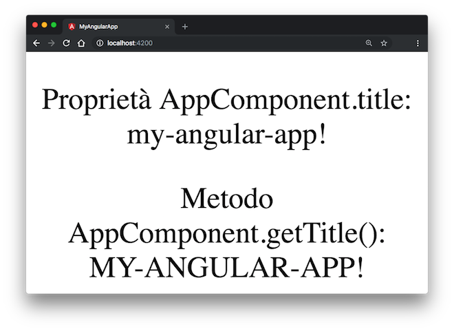 All’interno del file app.component.html potremo accedere alla proprietà title del componente AppComponent sia direttamente sia invocando il metodo pubblico getTitle().