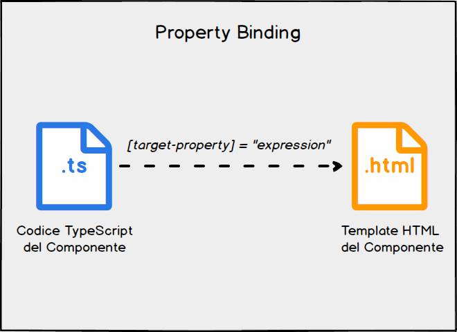 Esploriamo ora altri strumenti messi a disposizione da Angular per rendere i template dinamici e iniziamo a parlare del concetto di property binding che permette di assegnare a una proprietà di un elemento il valore di un’espressione valutata da Angular. Tale proprietà viene identificata col nome di target property. Un altro termine con cui ci si riferisce spesso al binding delle proprietà è one-way data binding evidenziando il fatto che le informazioni vengono inviate in modo unidirezionale dal componente, di cui si sta definendo il template, a una specifica proprietà di un elemento.