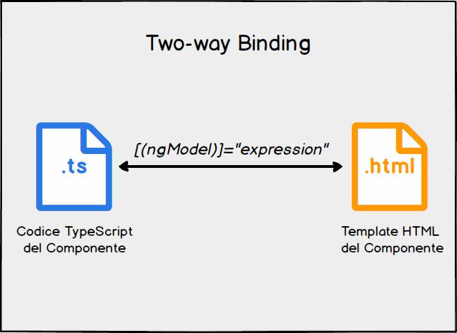 Per concludere questa lezione parliamo del l’ultimo caso di data binding che per certi versi è anche il più interessante, ovvero il two-way data binding. Questa tecnica permette di mantenere sincronizzate le informazioni presenti nel template con le proprietà del componente ad esse associate. Ogni volta che quest’ultime subiscono una variazione, viene aggiornata l’applicazione in modo da riflettere le ultime modifiche. Al contrario se le informazioni presenti nel template cambiano, alle proprietà corrispondenti del componente viene assegnato il nuovo valore.
