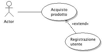 Il cliente poi potrà acquistare il prodotto che ha inserito precedentemente nel carrello della spesa. Ragioniamo un attimo su questo caso d’uso che risulta il più complesso da gestire: nel caso in cui l’utente sia registrato, prima del pagamento, viene richiesto il login mentre nel caso in cui l’utente non sia registrato viene richiesta la registrazione. Iniziamo modellando il secondo scenario, relativo alla mancata registrazione dell’utente. In questo caso il caso d’uso acquisto prodotto avrà un comportamente opzionale in quanto viene richiesta la registrazione e, rileggendo le definizioni delle associazioni possibili tra cosa d’uso, vedremo che quella corretta sarà un’estensione. Dunque il caso d’uso acquisto prodotto avrà un’estensione nel caso d’uso registrazione utente. Il diagramma relativo in UML sarà il seguente:
