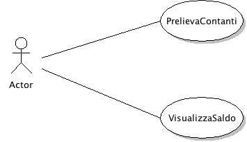 Come si può vedere il risultato è un diagramma molto chiaro e compatto. Il difetto di una notazione così compatta è che non si hanno informazioni su cosa fa, nello specifico, il caso d’uso e quindi è buona norma corredare i diagrammi dei casi d’uso di una descrizione in forma testuale e dettagliata sulle varie operazioni di quel caso d’uso. In certi ambiti infatti è obbligatorio fornire i diagrammi dei casi d’uso insieme alla descrizione testuale che deve seguire una determinata sintassi. Adesso mostreremo le varie parti costituenti un caso d’uso testuale fornenedo un esempio di compilazione per quanto riguarda il caso d’uso del prelievo del denaro.