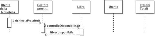Si lascia per esercizio al lettore il diagramma delle classi relativo al problema sopra esposto. Il nostro obiettivo è quello di modellare ciò che avviene quando un utente richiede un prestito del libro e per far ciò spieghiamo le interazioni presenti all’interno del sistema per poter espletare la funzione richiesta. Mostriamo adesso l’inzio del diagramma di sequenza che verrà poi dettagliatamente commentato: