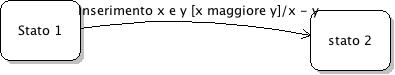 Per quanto riguarda la parola chiave Evento indica chiarmente il nome dell’evento che abbiamo preso in considerazione. La guardia è un costrutto opzionale e sostanzialmente controlla che sia verificate alcune condizioni prima di effettuare la transizione. Dunque il passaggio di un’oggetto da uno stato ad un altro, regolata da una transizione con guardia, non è immediato in quanto il solo evento non può far attivare la transizione. I costrutti azione 1.. azione n rappresentano tutte le azioni che l’oggetto compie dopo la transizione. Per chiarire ciò che fino adesso è stato esposto è opportno mostrare un esempio grafico: