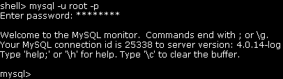 Dopo aver premuto invio, il sistema ci chiederà di inserire la password: se corretta il sistema avvierà il client MySQL… Questo quello che vedrete sul vostro monitor: