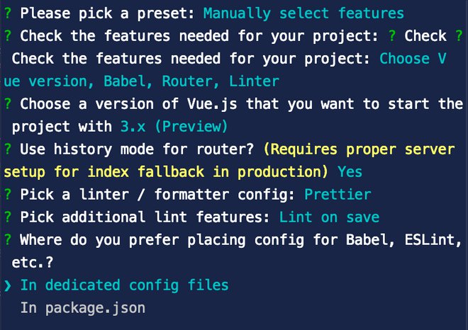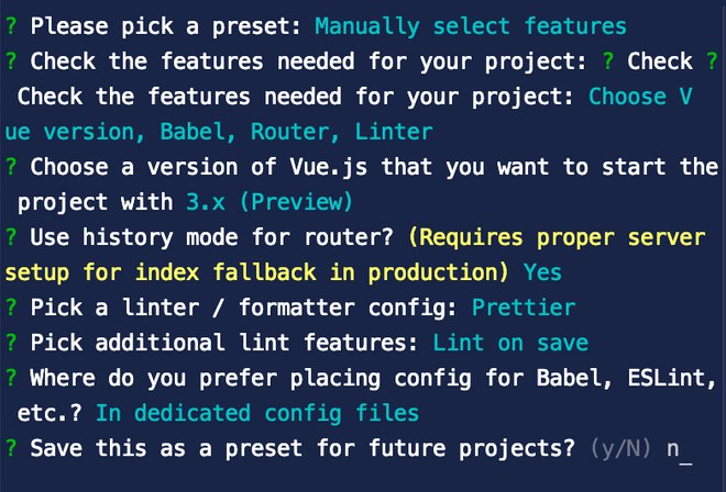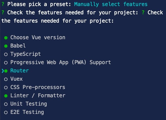Al passo successivo scegliamo di usare la modalità ‘history’ per il router che ci permette di ottenere i diversi percorsi degli url senza il carattere ‘#’. In questo modo invece di avere degli indirizzi del tipo ‘https://example.com/#contatti’, avremo semplicemente ‘https://example.com/contatti’. Come ci suggerisce Vue CLI dovremo però assicurarci di configurare correttamente i server se necessario.