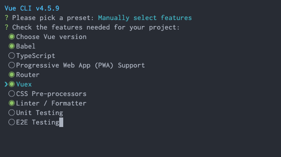 Spostiamoci allora in una nuova cartella e lanciamo il comando vue create vuex-demo e selezioniamo manualmente le funzionalità da aggiungere.