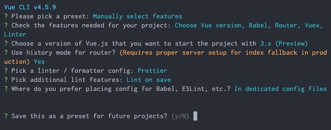 Selezioniamo Vue 3 come versione del framework e le altre opzioni in modo da ottenere una configurazione come quella riportata sotto.