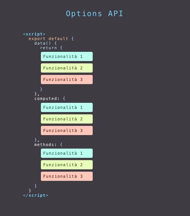 Se volessimo creare un componente con l’Options API andremmo a definirlo attraverso un oggetto che presenta dei dati, dei metodi ed eventualmente delle computed properties, dei watchers, dei lifecycle hooks e così via.