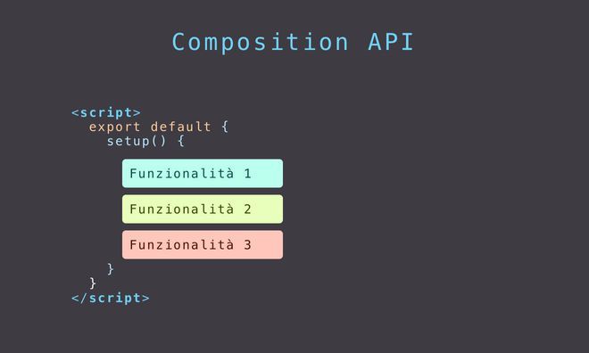 Al contrario, la Composition API mira ad organizzare e strutturare un componente in base alle sue funzionalità che non saranno distribuite in vari oggetti separati come accade con l’Option API.