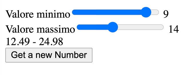 Nell’esempio riportato sopra abbiamo definito un componente attraverso l’Options API. Nel template inseriamo due elementi di input di tipo range per selezionare il valore minimo e massimo dell’intervallo in cui generare un numero casuale che assegniamo poi alla proprietà randomNumber. Attraverso un pulsante otteniamo ogni volta un nuovo valore casuale nell’intervallo specificato. Il valore casuale e il suo valore raddoppiato vengono quindi mostrati sullo schermo tramite interpolazione.