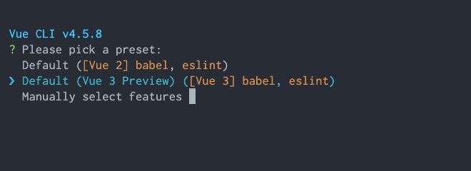 Per esempio, al momento in cui stiamo scrivendo questa lezione, la versione 4.5.8 di Vue CLI offre la possibilità di creare un nuovo progetto sia con Vue 2 che con l’ultima versione.