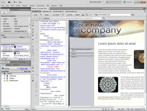 Dreamweaver rientra nella famiglia degli editor visuali di tipo WYSIWYG (acronimo di What You See Is What You Get): in pratica è possibile creare pagine web ma anche interi siti senza scrivere nemmeno una riga di codice. Grazie all’interfaccia di Dreamweaver, infatti, risulta abbastanza semplice creare layout, inserire testi, immagini, elementi multimediali ed altro direttamente attraverso comuni operazioni di Drag & Drop o mediante attività similari a quelle che siamo abituati a combiere coi comuni Word Processor (come MS Word).