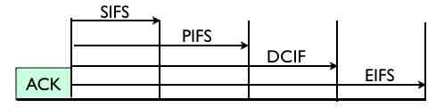 - SIFS (Short Inter Frame Space): Intervallo di tempo che è stato introdotto per consentire a chi ha effettuato l’accesso di mantenerlo. Questo perchè i messaggi vengono frammentati in frame piccoli, come spiegato precedentemente, meno soggetti ad errore. Se non fosse presente questo intervallo un terminale che deve spedire un messaggio frammentato dovrebbe aspettare, dopo aver inviato il primo frame, di accedere in maniera esclusiva al canale e ciò, come si può facilmente dedurre, non è un modo efficiente per gestire la trasmissione. Dunque un terminale che vuole inviare il secondo frame relativo ad un messaggio lo dovrà trasmettere necessariamente entro questo intervallo di tempo, altrimenti perderà l’accesso al canale trasmissivo. L’implementazione del SIFS deve essere accompagnata da una politica di invio dei frame tale dal limitare, ad un numero prefissato, i frame che una stessa stazione può mandare consecutivamente. Questa politica di gestione è fondamentale se si vuole evitare che una stazione monopolizzi l’accesso al mezzo trasmissivo e che le altre stazioni della rete non subiscano ritardi di acesso troppo elevati.