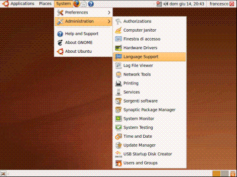 Clicchiamo quindi sulla barra dei menù (che di default è posizionata sulla parte alta dello schermo ma che può essere trascinata sulla parte bassa o su uno dei due lati) alla voce "System", poi "Administration" e "Language Support":