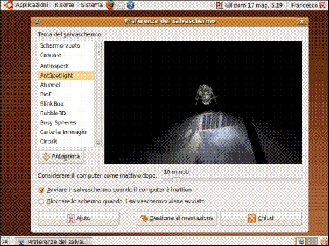 Si aprirà una finestra dalla quale potremo scegliere il salvaschermo da utilizzare, vederne un’anteprima ed impostare alcune opzioni (come, ad esempio, il tempo di inattività per l’avvio del salvaschermo).
