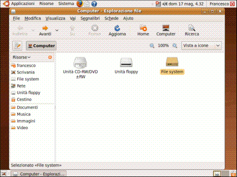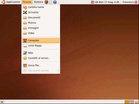 Appena terminata l’installazione notiamo che Ubuntu utilizza una gestione delle directory e delle periferiche diversa rispetto a Windows, la cui comprensione può risultare piuttosto difficoltosa ad un utente alle prime armi. Selezioniamo il percorso "Risorse", "Computer" come da immagine: