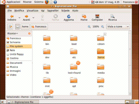 Come potete notare in Ubuntu, come in tutte le altre distribuzioni di Linux, i dispositivi e le periferiche non sono identificati da lettere (es. C: disco rigido, D: lettore/masterizzatore cd, ecc..) come su Windows. Nei sistemi Linux i file, i dispositivi, le periferiche vengono gestiti dal sistema operativo come se fossero dei semplici file ed organizzati in cartelle. Ad esempio (vedi immagine qui sopra) all’interno della directory Root ("/") troviamo tutto quello che abitualmente in Windows è reperibile sotto C:, cioè il contenuto del nostro disco, ma non solo! troviamo, infatti, anche una serie di collegamenti verso i dispositivi e le periferiche collegate al computer.