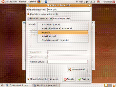 Quando richiesto inseriamo la password per ottenere i privilegi amministrativi. Nella nuova finestra selezioniamo "Impostazioni IPv4", "Manuale":