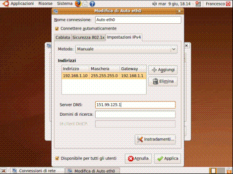 Supponendo di avere il pc collegato via cavo o wireless ad un router Adsl con server DHCP attivato, il nostro Ubuntu prenderà in automatico l’indirizzo IP assegnatogli e sarà immediatamente in grado di accedere ad internet e quindi di eseguire gli aggiornamenti della lingua insieme ad altri eventuali aggiornamenti fondamentali.