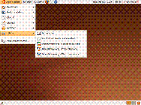Ubuntu installa di default Open Office, un ottimo pacchetto di Office Automation simile per potenza e completezza a Microsoft Office. Gli applicativi installati sono Foglio di calcolo, Presentazione e Word processor, più Disegno per creare e modificare disegni. Per eseguirli selezioniamo il menù "Applicazioni", "Ufficio":