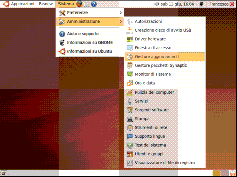 Quando sono disponibili degli aggiornamenti, Ubuntu avviserà attraverso un messaggio e un’icona nell’area di notifica; per effettuare l’aggiornamento selezioniamo "Sistema", "Amministrazione" e "Gestore aggiornamenti":