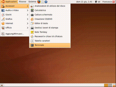 Vediamo quindi come svolgere alcuni semplici operazioni nella shell. Lanciamo la finestra del terminale selezionando il menù "Applicazioni", "Accessori" e "Terminale":