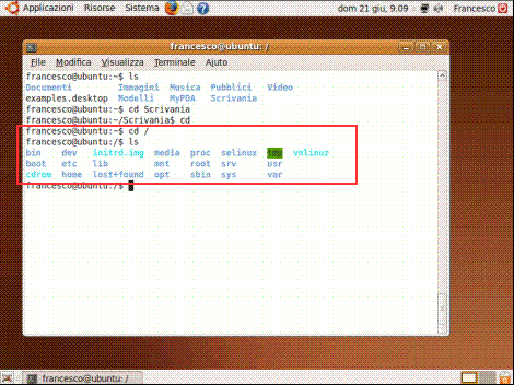 digitando "cd" seguito da una slash ci spostiamo nella directory radice di tutto il sistema, la directory principale che contiene tutte le altre: Dal momento che non siamo più all’interno della nostra directory personale o in una sua sottodirectory, il carattere tilde è scomparso.