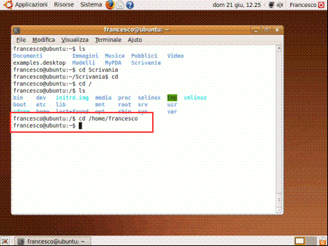 Supponiamo ora di volerci spostare all’interno di una directory specifica di cui si conosca il percorso; nel nostro caso ci sposteremo all’interno della cartella personale che nel mio caso è "francesco" e si trova sotto "home":