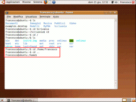 Si può anche tornare indietro nell’albero delle directory, posizionandosi nella directory precedente (nel nostro caso "home"), con il seguente comando: