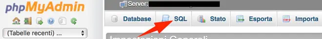 Utilizzando phpMyAdmin accediamo al database del nostro sito WordPress e clicchiamo sulla tab SQL.