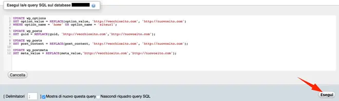 Nell’area di testo inseriamo le istruzioni SQL (che vi mostrerรฒ qui sotto) avendo cura di modificare tutte le occorrenze di VECCHIA_URL con la URL attuale della nostra installazione di WordPress e quelle di NUOVA_URL con la nuova URL.