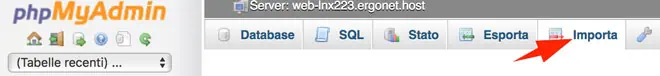 Una volta creato il nuovo DB (ed il relativo utente) andiamo a riversarvi dentro i dati. Per farlo apriamo phpMyAdmin, selezioniamo il nuovo database e clicchiamo sulla tab Importa: