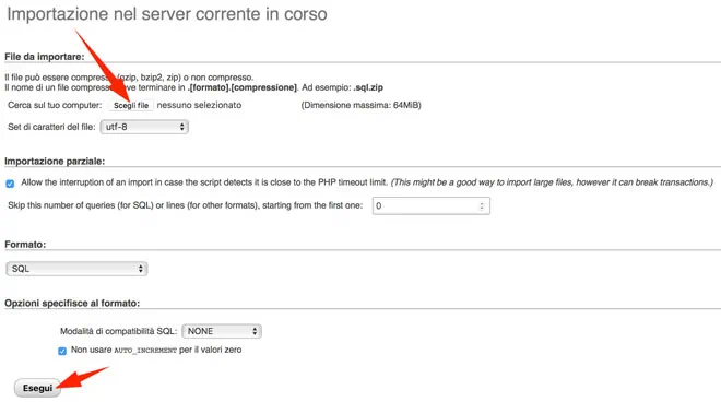 Selezioniamo dal nostro hard-disk il file contenente il dump del vecchio database ed eseguiamo l’importazione.