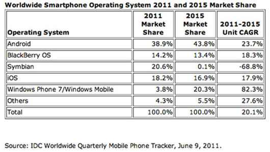 Secondo IDC, infatti, nel giro dei prossimi anni (più precisamente nel 2015) i dispositivi mobili dotati di sistema operativo Android saranno il 44% del totale, seguiti dal 20% di Windows Phone 7 ed il restante 30% sarà ad appannaggio di Apple (con il suo iPhone) e RIM (con il suo BlackBerry).