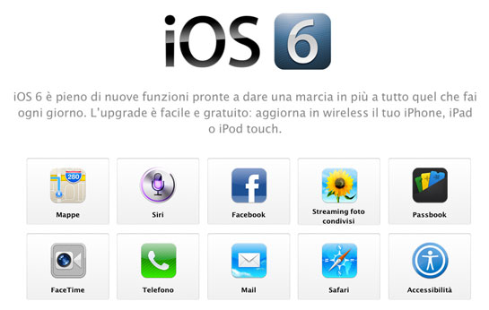 iOS 6, ultima versione del sistema operativo creato dalla casa di Cupertino, è finalmente disponibile per effettuare l’aggiornamento delle vecchie release; chi già utilizza iOS potrà effettuare l’upgrade in modalità over-the-air, cioè senza la necessità di collegare il proprio device ad un computer.