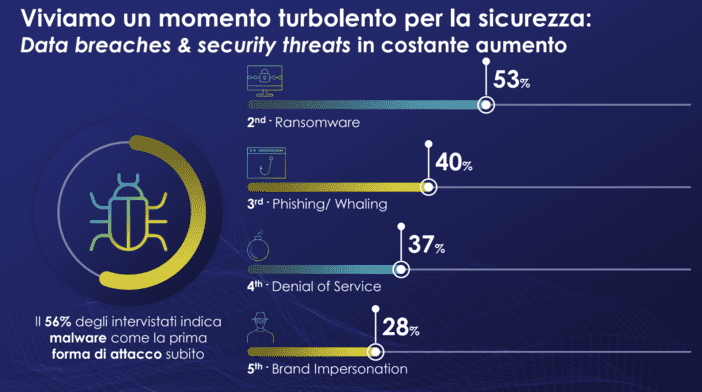 A livello globale, i leader IT hanno indicato malware (56%), ransomware (53%) e phishing (40%) come le principali cause di attacchi alla sicurezza. La gestione di questi rischi è una sfida continua, come riconosce la metà (45%) degli intervistati che segnalano un aumento del volume, della gravità e/o della portata dei cyberattacchi negli ultimi 12 mesi.