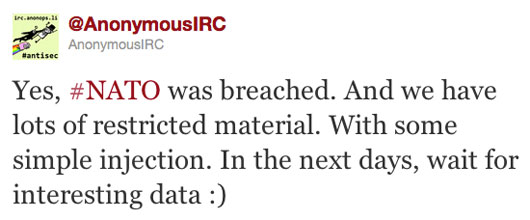 Secondo quanto comunicato tramite Twitter dagli stessi componenti della crew di hacktivisti Anonymous, i server della NATO sarebbero stati violati e nel corso delle prossime ore potrebbe comparire in Rete parte del materiale trafugato durante l’incursione.