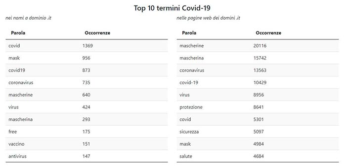 Sono stati analizzati i domini .it registrati da gennaio a dicembre 2020 contenenti un set di parole chiave come: coronavirus; covid; virus; tampone (o tamponi); terapia intensiva; vaccino (o vaccini); respiratori (o respiratore); ventilatori; mascherine; autocertificazione; lockdown; pandemia; ecc. Di seguito una interessante tabella con i termini più diffusi: