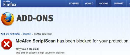 I tecnici della Fondazione Mozilla hanno deciso di bloccare l’estensione per il browser Firefox della nota applicazione antivirus prodotta dal colosso McAfee, i motivi di questa scelta andrebbero ricercati nei troppi crash causati dall’installazione e dal funzionamento del plugin.