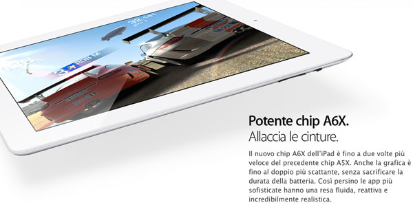 Il nuovo modello mantiene intatto il design che è proprio della terza generazione del dispositivo, ma ora è equipaggiato con un processore più potente, un A6X che dovrebbe offrire un livello di performances doppio rispetto all’A5X del New iPad anche dal punto di vista del rendering grafico.