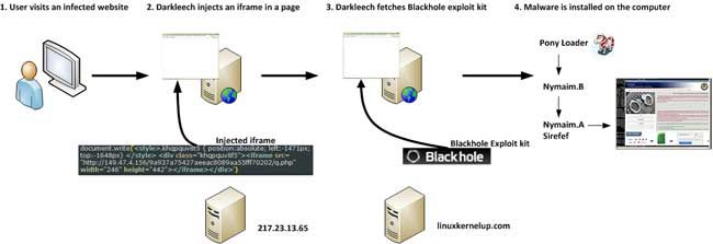 A livello di frontend il demone manipolato dovrebbe dar luogo alla generazione di un iframe prodotto appositamente per la redirezione del traffico; una volta effettuato il redirect verrebbe effettuato un secondo passaggio, basato sull’exploit kit Blackhole, per verificare la presenza di falle nei browser.