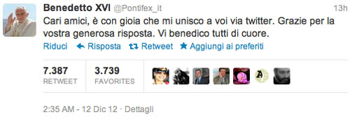 "Cari amici, è con gioia che mi unisco a voi via twitter. Grazie per la vostra generosa risposta. Vi benedico tutti di cuore", questo il testo inviato tramite l’account @pontifex_it che ha permesso al Pontefice di inaugurare una nuova era della comunicazione tra i fedeli e il soglio di Pietro.